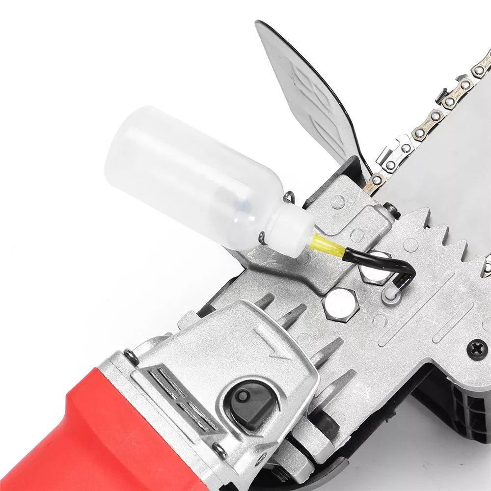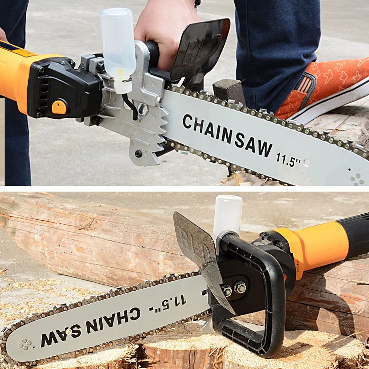 - Are you tired of stubborn gasoline chainsaws? Or don't want to invest in an expensive machine? Now convert your angle grinder to electric chain saw in a minute! One lightweight attachment will replace big and heavy chainsaw. Improve efficiency of work wich woodcutting and save your energy and money. The attachment features an 11.5-inch chainsaw bracket which assists in using grinder's power as a driving engine while using the torque to power the saw. The tool can be used for a range of applications including forest harvesting, chopping firewood , lopping, building material to cut wood, bamboo harvesting and more. In the form of an alternative solution to the chainsaw, this is a cheaper and convenient way to get all your jobs done.