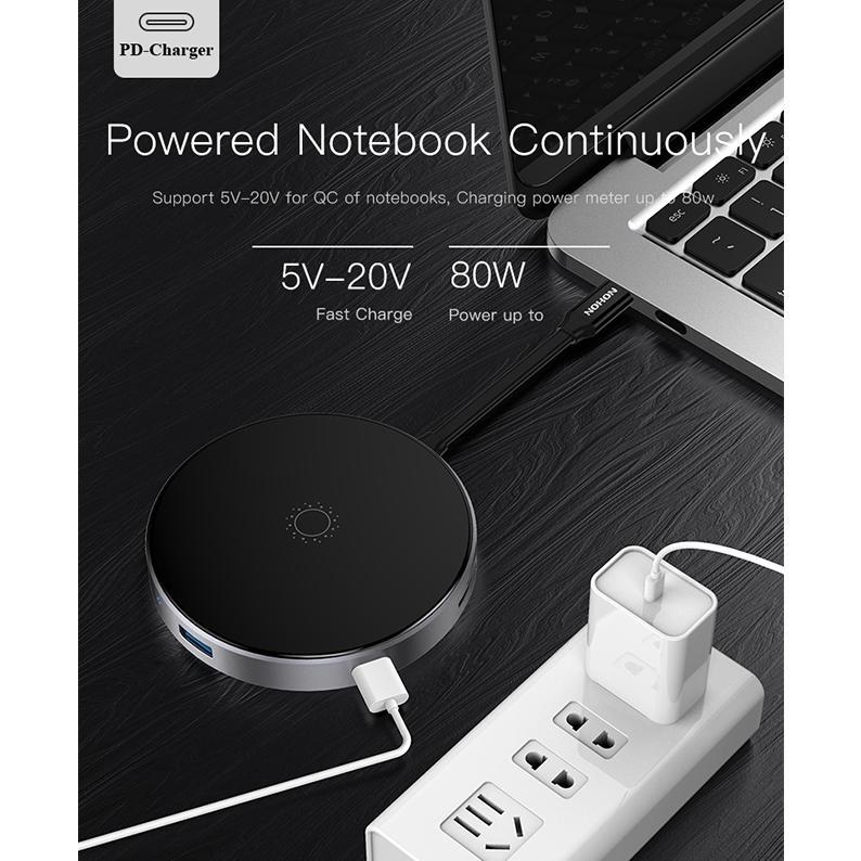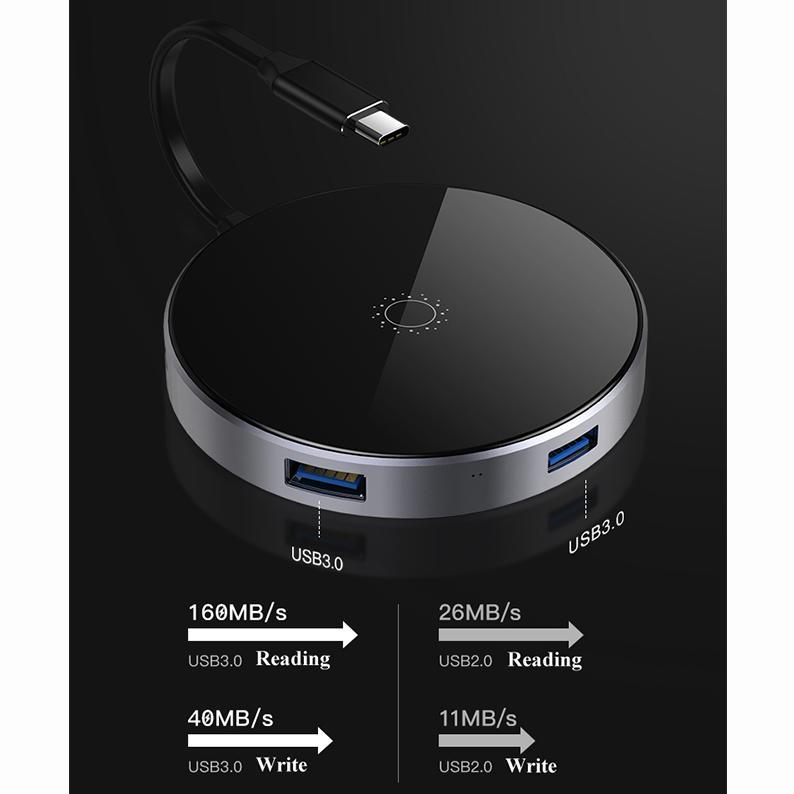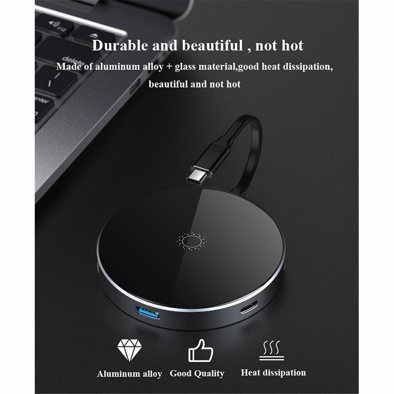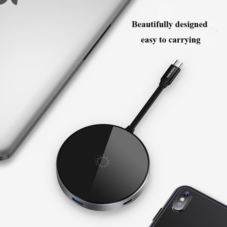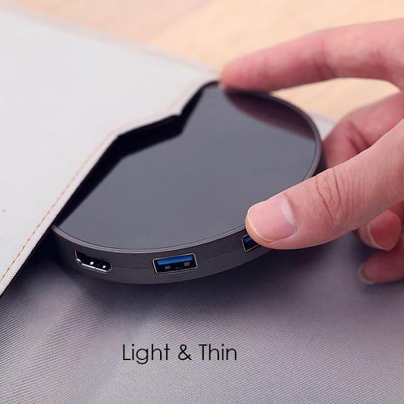 This compact device has it all. As well as holding 3 USB ports, 1 USB-C port, one HDMI port, and one TF card slot, this hub also has a wireless charger in it.